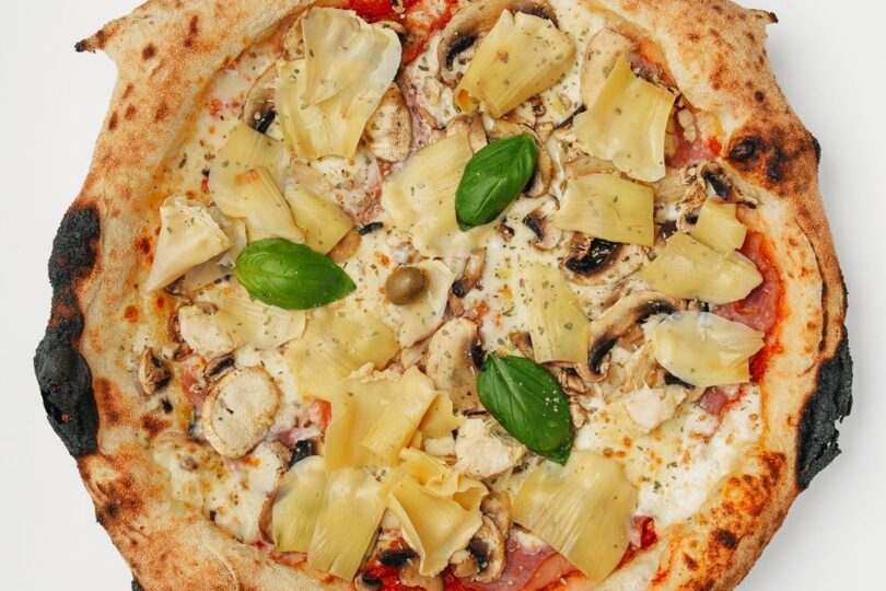 San Marzano DOP rajčica, mozzarella Fior di latte DOP, šunka, gljive, artičoke, maslinovo ulje extra vergine, maslina